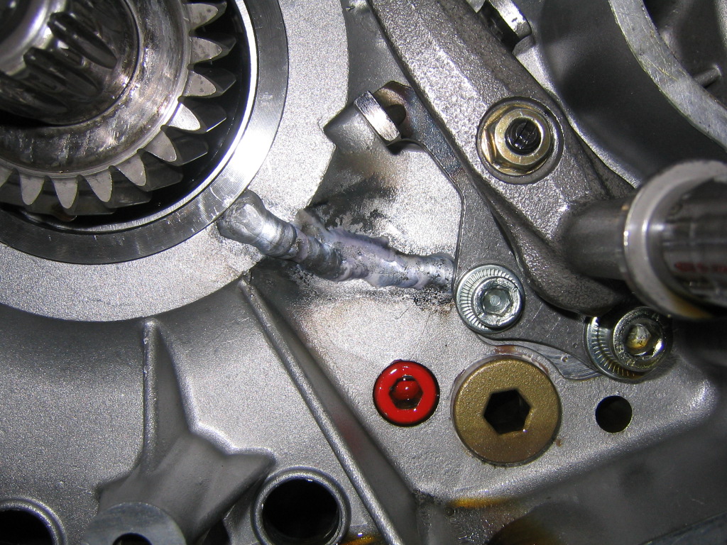 888レーシング'93のエンジンですが、開けてみてびっくり。割れたクランクケースを溶接して使っています。こんなことする人がいるんですね。