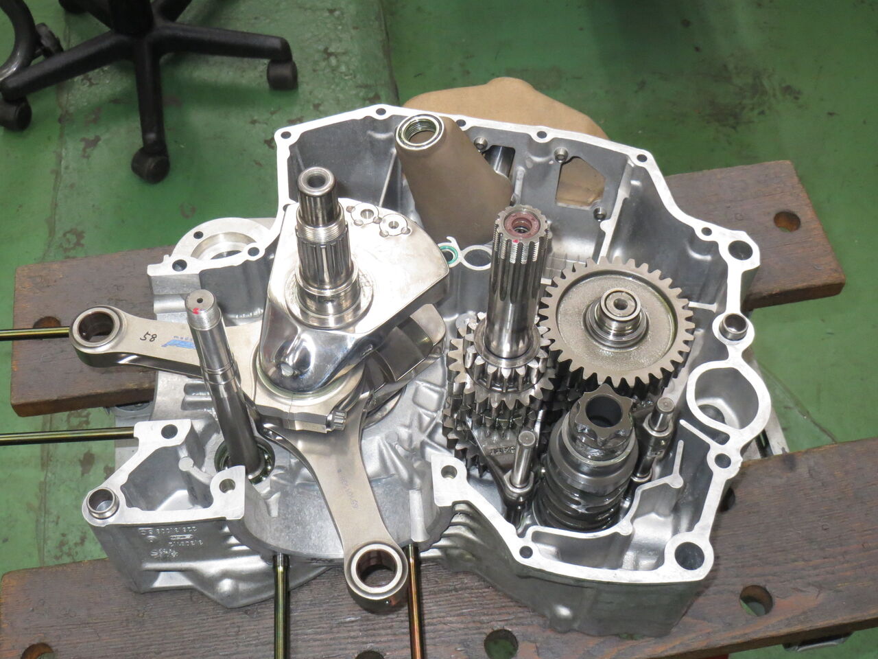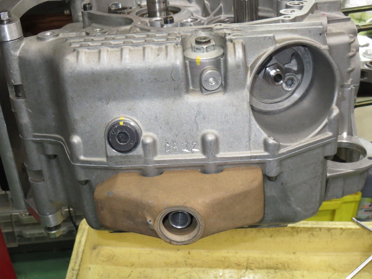 こういったレース専用エンジンの場合、セルフスターターは最初から装着されていません。エンジンスタートは押し掛けもしくはリアホイールスターターを使用するのが前提です。そのためにこのクランクにはストリートバイクのクランクシャフトにはもれなく存在しているセルフスターター用ワンウェイクラッチを潤滑するためのオイル通路がありません。今回このエンジンはセルフスターターを取り付けて使用するのでオイル通路を設ける加工が必要となります。