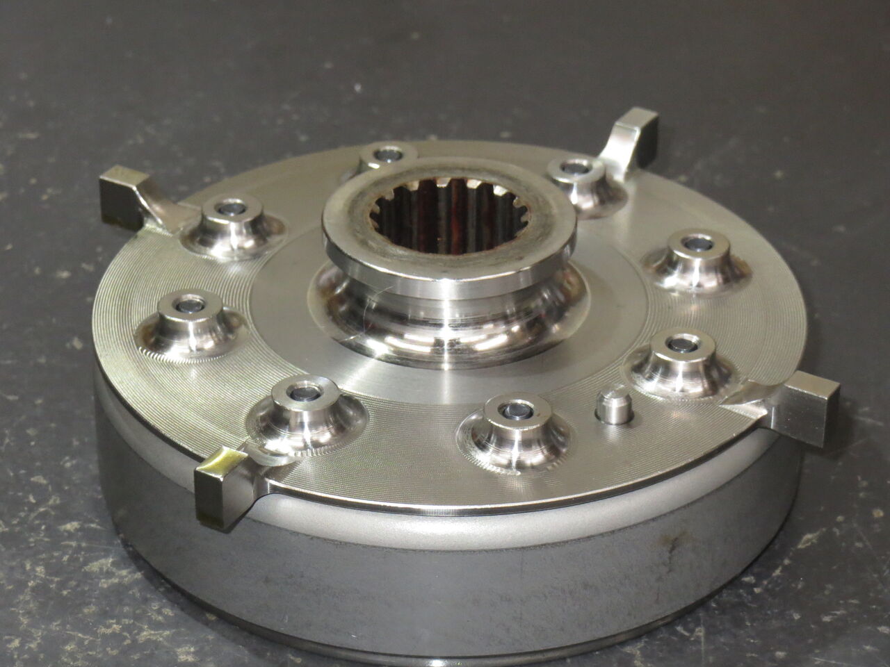 これが996F00エンジンのオリジナル、純正フライホイールです。996RS01も同じものが使われています。セルフスターター機構が無いのでこのような簡素な造りになっていますが、美しいというか凄いというか過激というか、何といえば良いのでしょう、、、。画像下側の色が異なる部分は発電機のローターなので、フライホイールはその上にある薄い板から上の部分です。