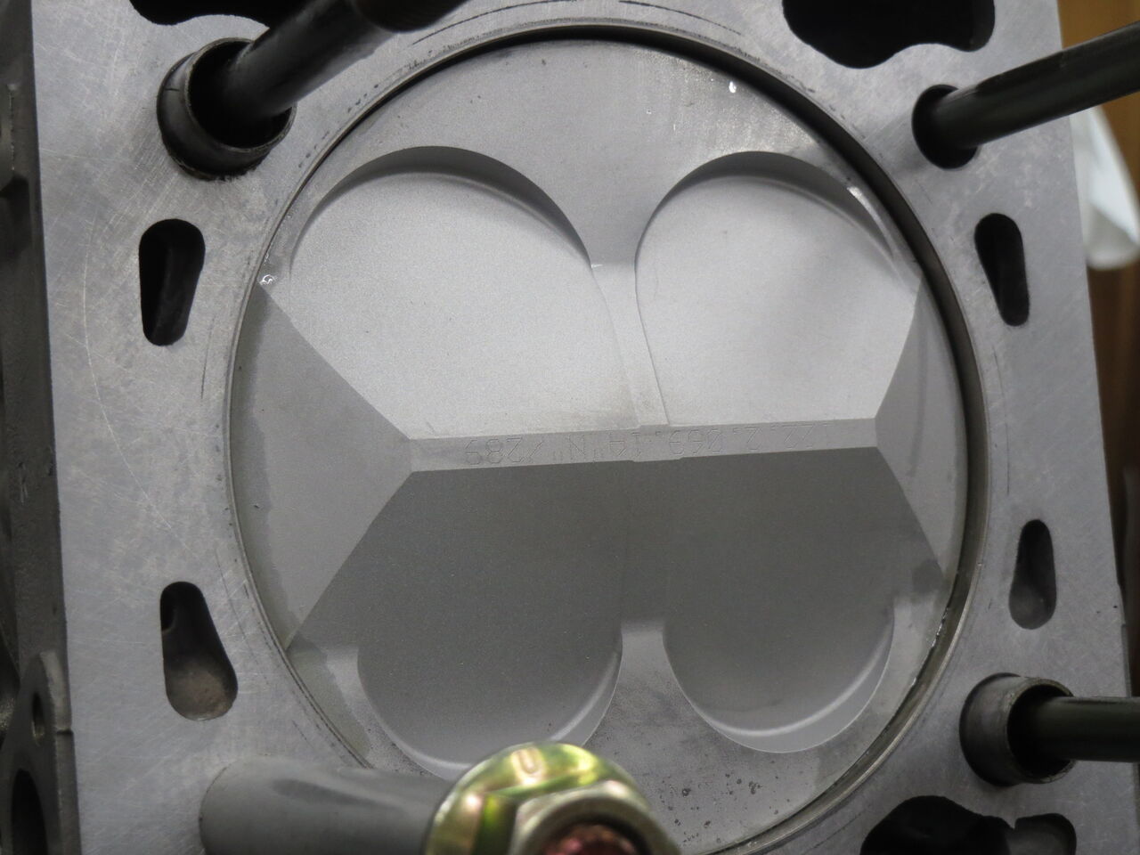燃焼室です。デスモクアトロエンジンなのでバルブ挟み角はIN、EX、ともに20度で合わせて40度です。バルブ径は39mmと32mmです。現在の最新エンジンと比較すると燃焼室形状は一時代前の印象がありますが、スーパーバイクレギュレーションの中で製作されたものですからノーマルストリートバイクのヘッドの改造品と言う事を鑑みると凄い造りだと思います。 バルブシートはすり合わせとシートカットによりバルブとの当たりを取り直してあります。このエンジンは走行時間が進むと特にインテークバルブの当たりが悪くなるので頻繁にその確認と修正を行っています。具体的に言うとインテーク側のスパークプラグの傍とスタッドボルト穴の傍の2ヶ所でバルブとシートが当たらなくなります。あくまで冷間で部品単体での確認ですから、実際にエンジンが稼動している状態でどうなっているのかは知る由もありませんが、さりとてそのまま組むわけにもいきませんのでバルブとシートがちゃんと当たるように修正を行っています。