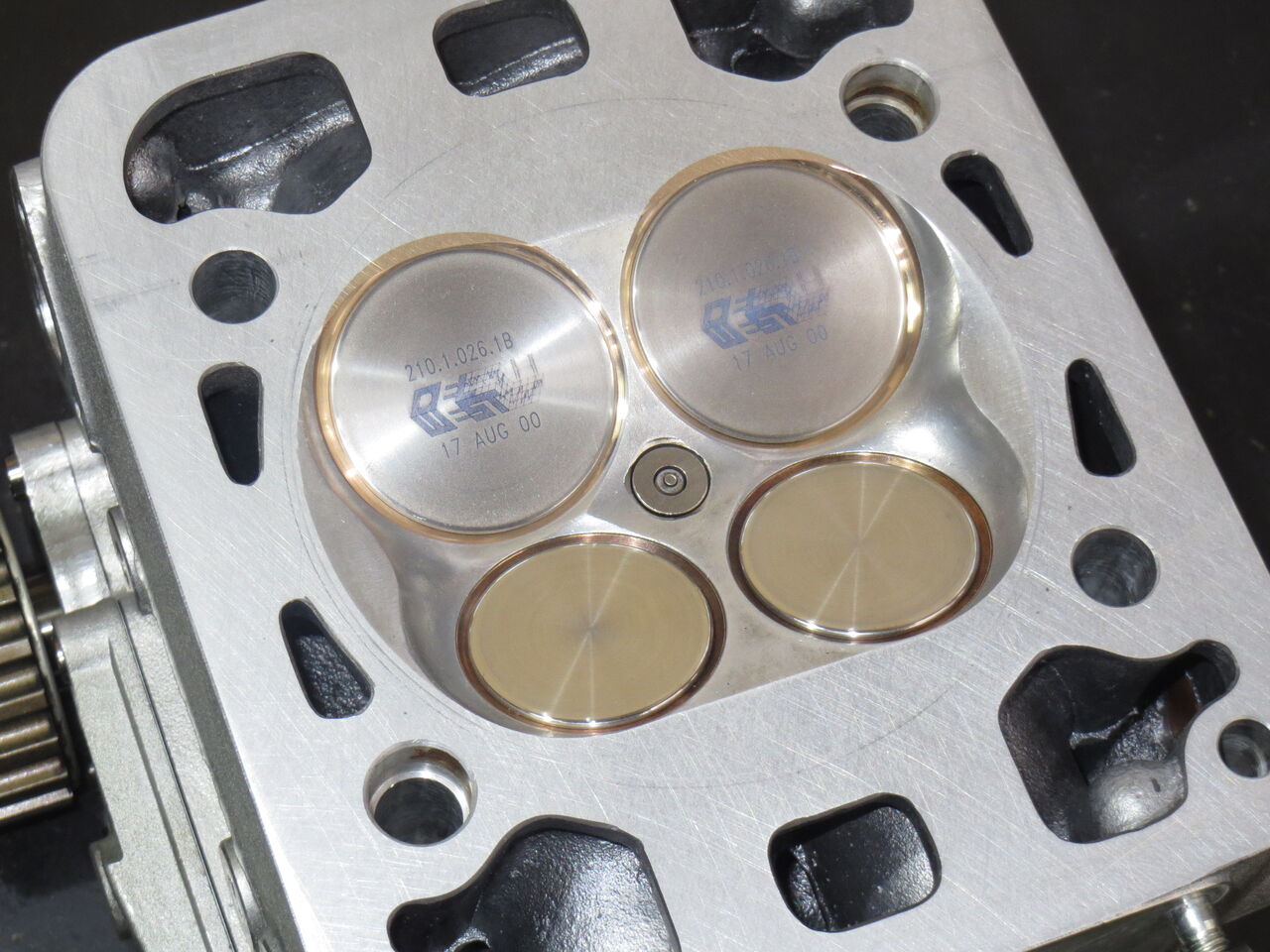 組み上がったシリンダヘッドです。インテークバルブはDel West製です。この時代以降のチタンバルブはこのメーカーがサプライヤーになっているようです。エキゾーストバルブの方はまだスチール(ニッケル合金のナイモニック)で昔からの定番のC.MENON製です。エキゾーストバルブもチタン製になるのは998RSからです。 インテークバルブ周辺をよく観察すると、バルブの中心とバルブシートの中心が若干ずれていることが判ると思います。バルブシートの見える部分の幅が均一ではないのでそう判断できます。理由は不明ですが、わざわざそうするのですから明らかな理由が有るのでしょう。