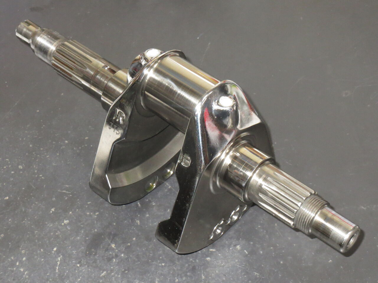 半月型キー溝の横に開けた穴が今回追加加工したオイル通路です。クランクシャフトのような硬い部品に穴を開けるのはなかなか骨が折れます。画像で見える穴の直径はφ2.5mmですがその径で空いているのは途中までで、穴の奥の穴はφ0.8mmの穴になっています。そのようにオイルの流量を規制しているということです。超硬のドリルで深さ8mm程度まで穴を開け、その先の残り2mmに0.8mmの穴を貫通させる作業はとてつもなく緊張します。失敗してドリルの歯を折ってしまったりしたらエライ事になりますからね。幸いなことに今迄かなりの数をこなしてきましたが、今のところ失敗は皆無ではあります。