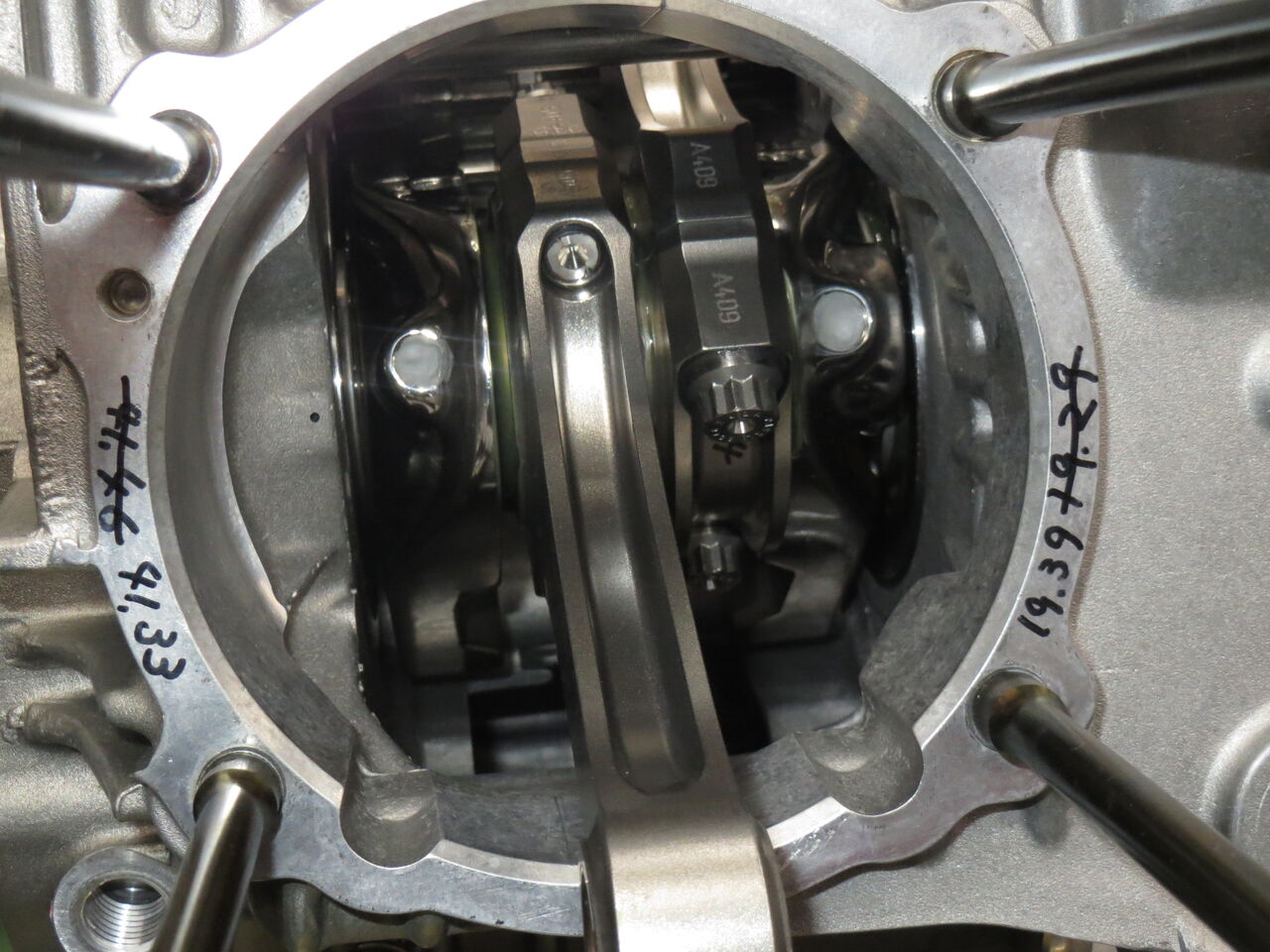 メタル合わせを行った後にクランクにコンロッドを組み付けたところです。このコンロッドは使用するメタルの厚さが一般のストリートバイクと異なります。ストリートバイクに使われているメタルの厚さは呼びで1.5mmなのですが、このコンロッドに使用されているメタルの厚さは呼びで2.0mmです。クランクピンの直径はストリートバイクと同じくφ42mmなので、何が違うかというとコンロッド大端の直径です。実際に使用してみると良く判りますが、過酷な使用状況下では2.0mmのメタルの方が明らかにストレスに対して余裕が有るように感じられます。Posted by cpiblog00738 at