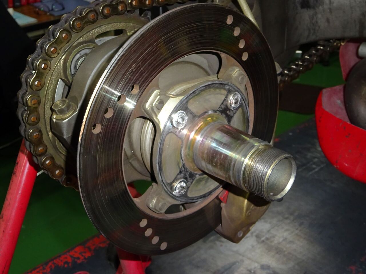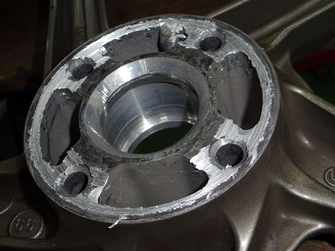 スピンドルのハブに関してはピンを交換すれば済むので大したことではありませんが、ホイール側がえらいことになっています。空回りさせてしまった結果、ハブの当たり面が削れてしまいました。こうなるとこのホイールは使用不可です。スペアのホイールに交換です。