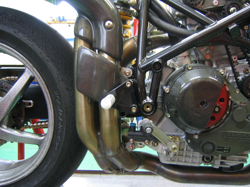 フルエキはなんと!φ57mmです。本当はφ54mmがベストマッチかと思ったのですが、あいにく手持ちが無い!元々付いていたのは当時のSTDであるφ50mm。今時これはちょっとイケてないので、以前TFDで走らせていたRS01のスペアだったφ57mmが登場しました。これは以前何回かの転倒歴があるので、それなりにキズがあります。元々はカーボンサイレンサーだったのですが、転倒で片側が壊れ、そっち側だけチタンのサイレンサーになっていました。私は左右の材質が揃っていなくても気にしていなかったのですが、今回は新しいオーナー様のため、もう片方もチタンに組替えました。