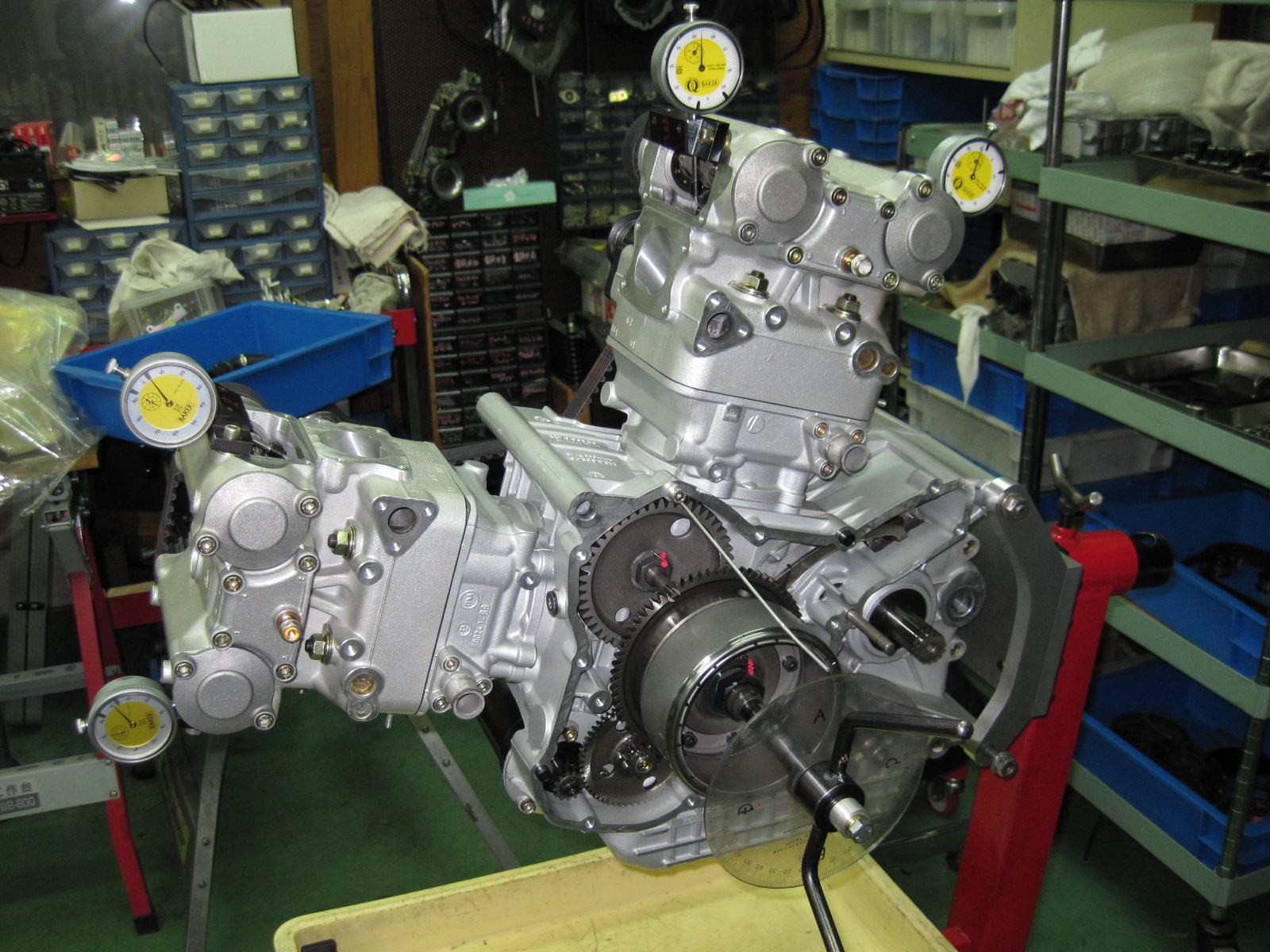 シリンダー、ピストンとヘッドを組みつけ、バルタイを測定しています。勿論前回のオーバーホール時に適正なバルタイに調整してあるので、あくまで確認です。でもたまに何故だか判りませんが再度調整が必要な事もあります。
