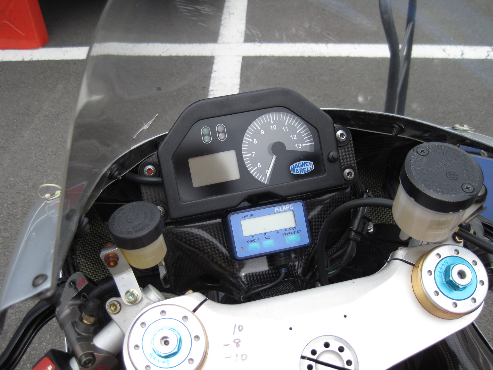 FISCOのパドックで撮った748RSのメーター周りです。マレリ製のディスプレイが標準装備です。アナログ針のタコメーターですが、液晶よりはこちらの方が見易かったりします。タコメーター左の小窓には液晶で水温、油温、エンジン回転数、その他色々な物を表示させる事が出来ますが、未だにその使い方すべてを把握できておりません。