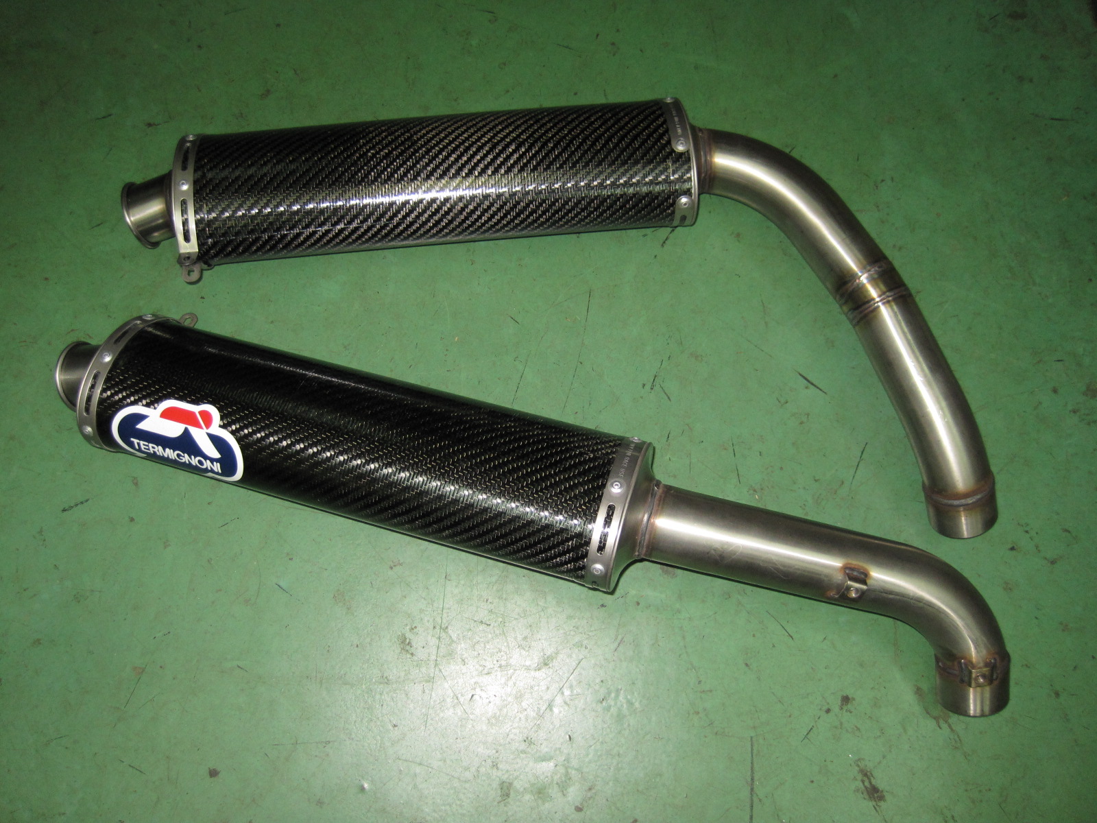 左側のエキパイ部分に2箇所溶接の痕があります。テルミニョーニでは良くあることですが、このサイレンサーはバイクに装着した時の立て付けが非常に悪かったため、根本的な解決のためにエキパイを一度切って溶接し直しています。ということで取り付けに関しては全く問題ありません。新品ですが、現物合わせのために車体に何度か脱着を繰り返しましたのでその痕跡はあります。エンジンはかけていません。