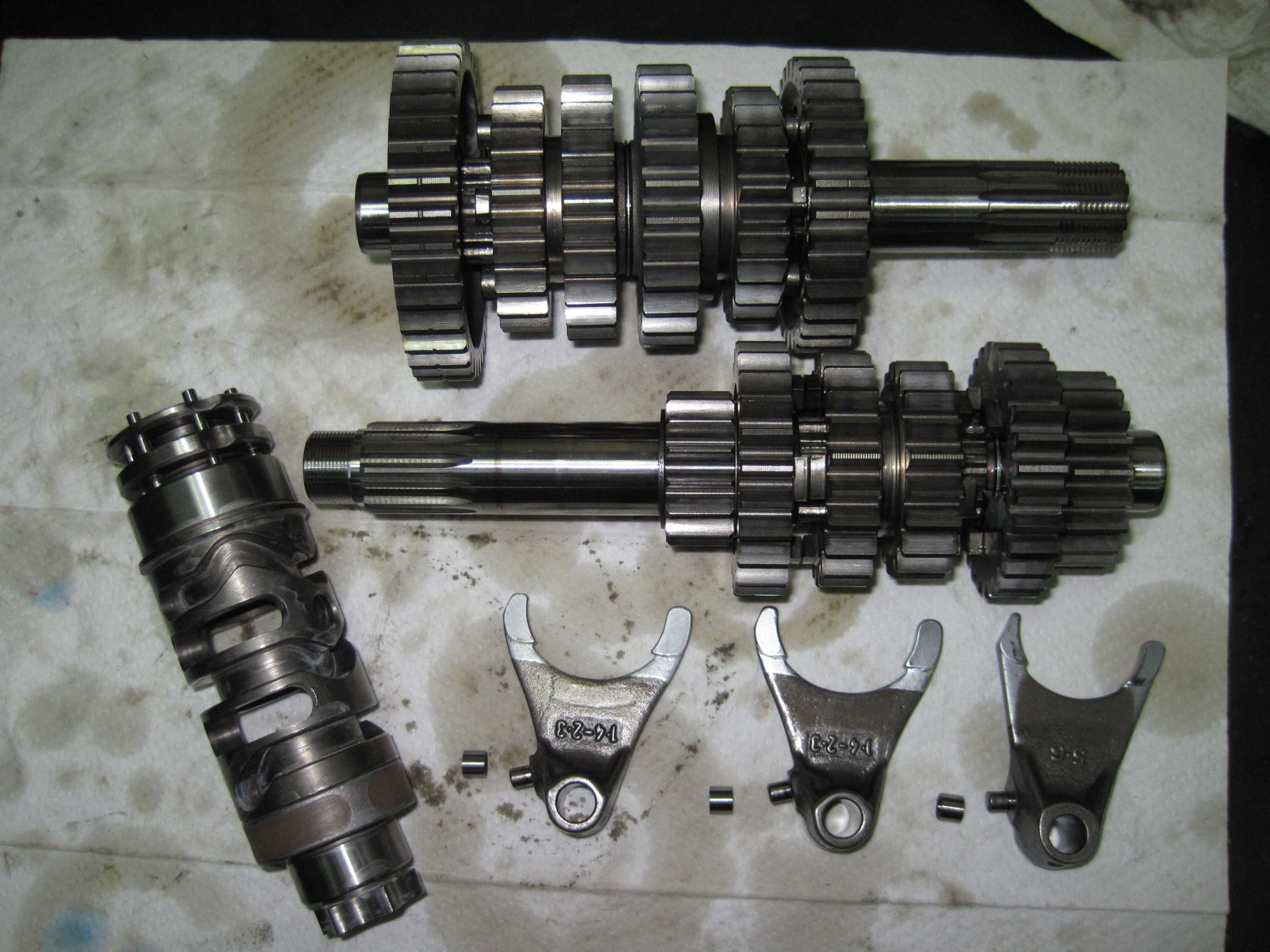これらはギアボックス関係の部品です。いろいろとシミュレーションしてどんな仕様で行こうかと迷いましたが、基本的にミッションのレシオはノーマルです。筑波では3〜5速もしくは6速を使う仕様です。水冷4バルブエンジンと比較して常用するエンジン回転数が約3割くらい低くなりそうなので、レーシングレシオのミッションを使って水冷4バルブのバイクと同じギアを使って走ろうとすると、リアスプロケットが28丁とかの非現実的な数字になりそうです。シフトドラムは穴あき軽量化された某市販車の部品、シフトフォークはコルサの部品でドラムの溝に入るピンがローラーになっていて、その効果でシフトタッチがかなり良くなります。