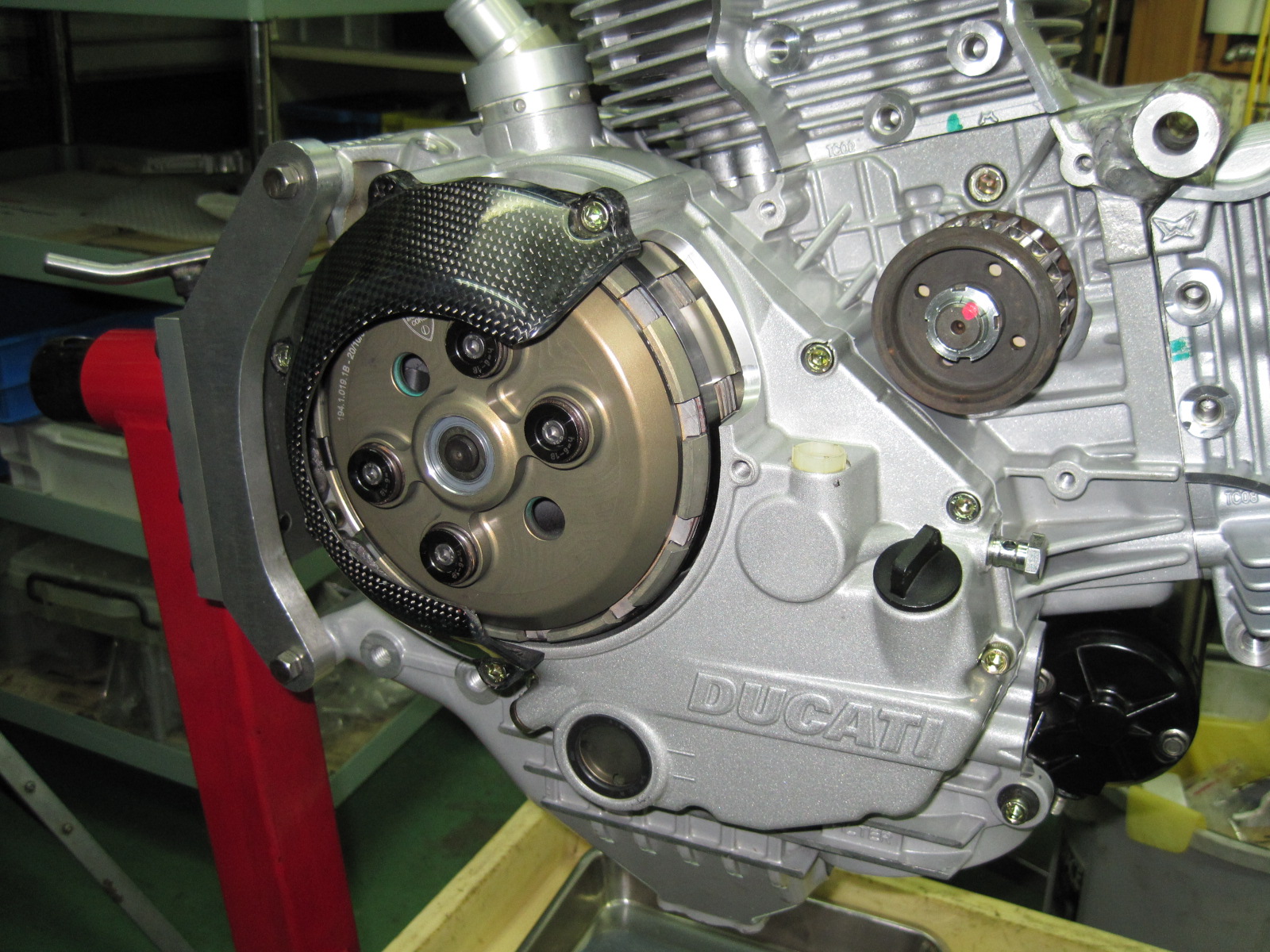 クラッチを組みました。暫定ですが4本スプリングのタイプです。999RSの部品です。ボールベアリングは使われておらず、単純にカムに乗っかってドラムが持ち上がるタイプです。