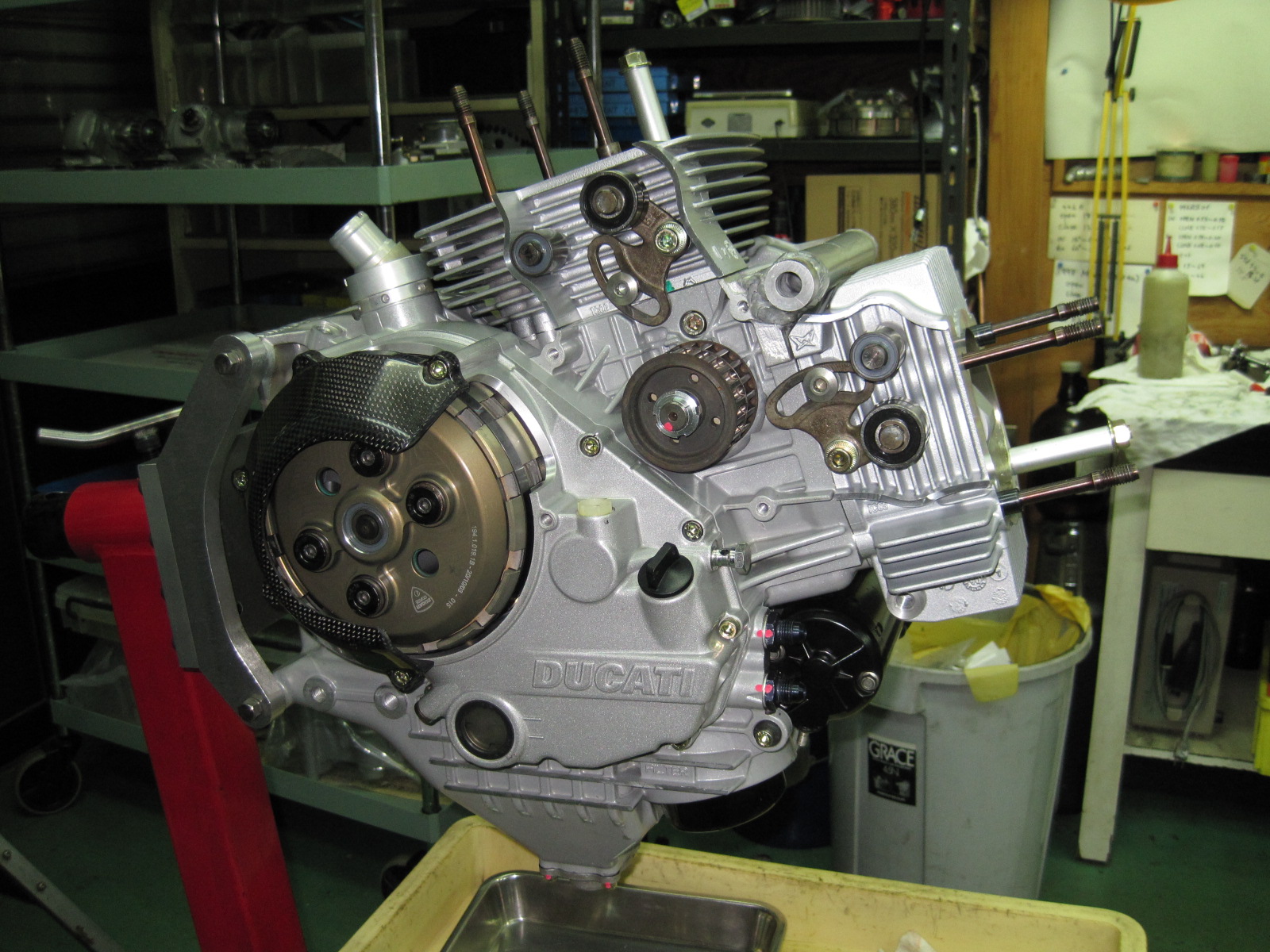 現在ヘッドガスケットの入荷待ちで、この状態で作業が止まっています。ヘッドは既に出来上がってるので、部品が来ればヘッドを組み付けてエンジンは出来上がりです。ただしまだ先は長いです。エンジンをフレームに載せてインマニやスロットルボディーの取り付けを考えたり、排気系をどうするかとか、ワイヤーハーネスの作成もしなければなりません。そうした作業の後にバイクの形になって、形だけでも走れそうなところまで出来上がったらそこでもう一度エンジンを降ろし、動力計に載せてマッピングです。そう考えるとまだまだ大変です。