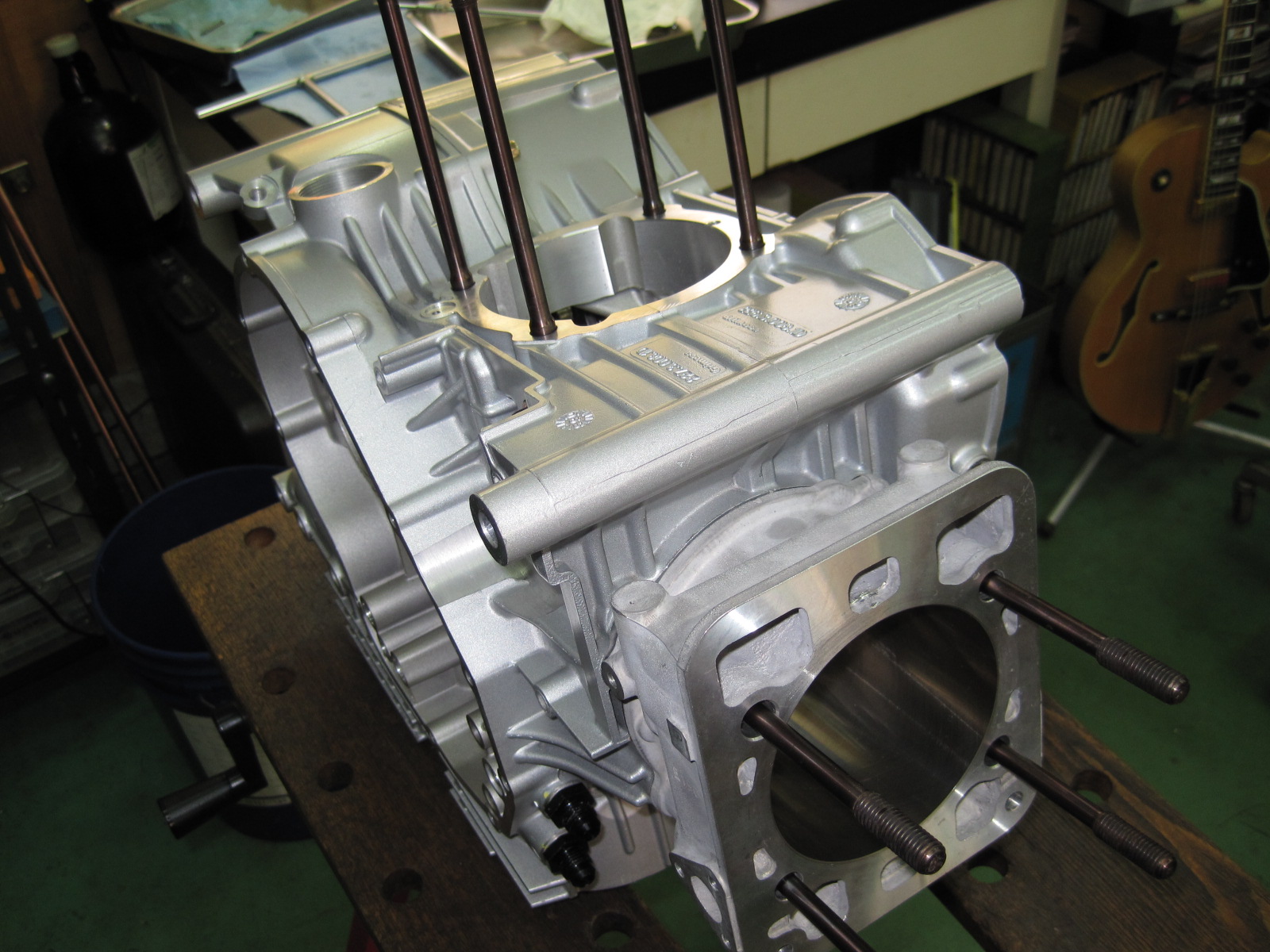 748Rのクランクケースですが、シリンダーが入る穴をボーリングして大きくしました。目的はφ96mmのシリンダーが使えるようにするためです。画像は748Rのクランクケースにφ96mmの955シリンダーを仮組みしたところです。TFDにはこのシリンダーと955レーシングのピストンが大量にあるので、これを748Rに組んでみようと思ったのです。排気量は890ccになります。ストロークは変わらず、ボアアウトのみで890ccになるので、どんな回転上昇のフィーリングになるのか楽しみです。とは言え、いったいいつ出来上がるのか・・・。なにしろ計画を思いついてからクランクケースのボーリングに取り掛かるまで何年かかかっていますからね。どなたかこの計画に「乗った!」と言って下さるお客様はいらっしゃいませんか?748Rでサーキットを走行されている方、今使っているエンジンの下取りも歓迎ですよ。