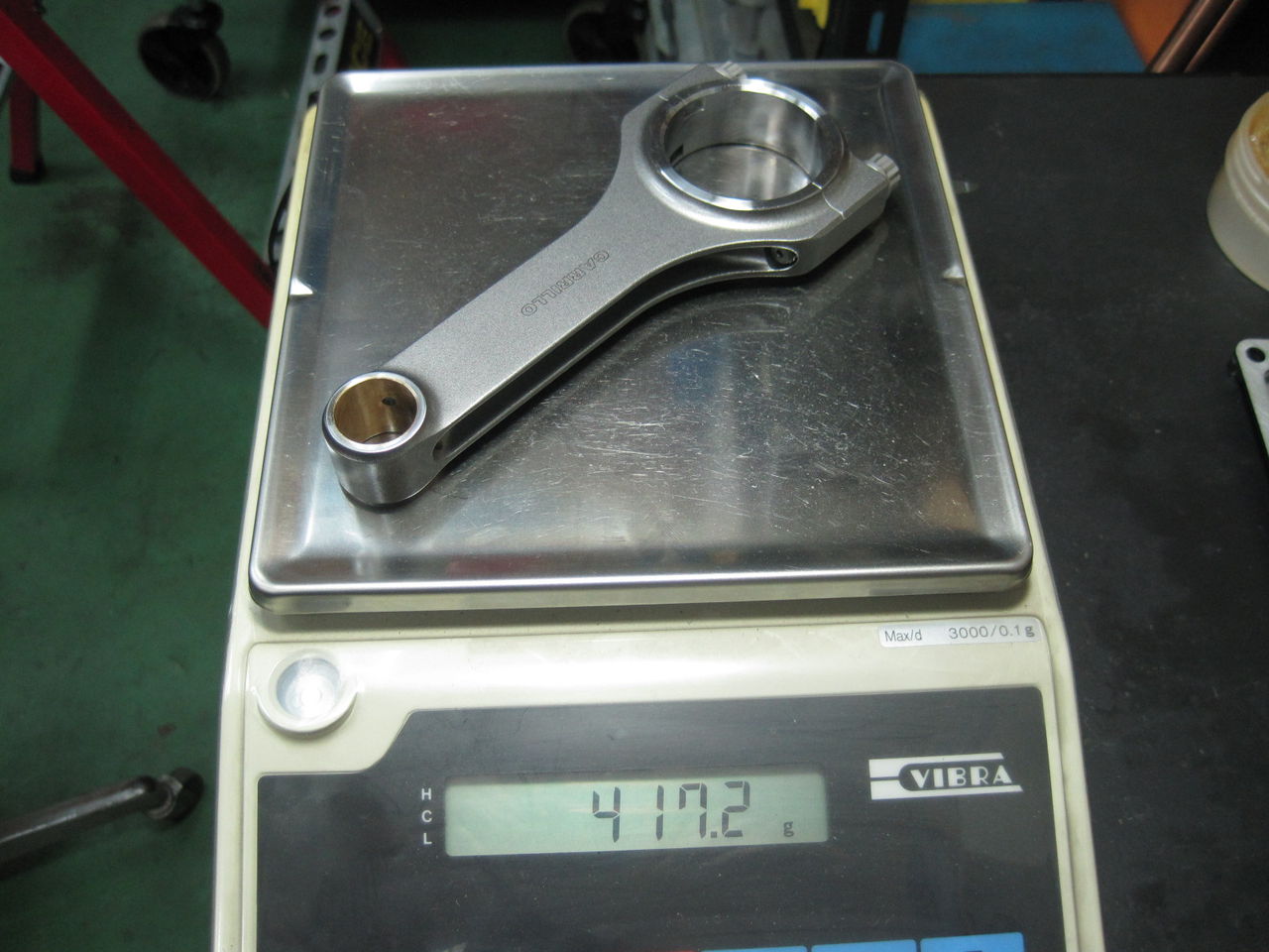 画像のコンロッドの重量は417.2グラム。もう1本は秤の表示が417.2グラムから417.3グラムを行ったり来たりです。おそらく2本の重量差は0.05グラム程度。恐るべき精度ですね。