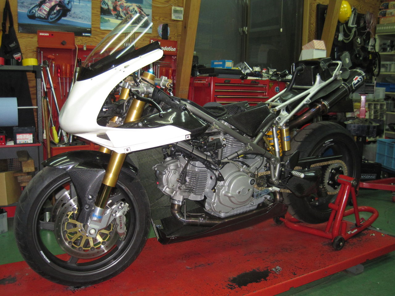 なんとなくバイクの形になってきました。結構出来上がっているように見えて、実はまだまだ先は長いです。サイドのカウルで手前を覆ってしまえば、まるで916レーシングですね。そもそも何故このようなタイプのバイクにしようと思ったかというと、自分が好きで一番理解しているバイクのタイプであるということもありますが、実は一番大きな理由が他にあります。それはバイクを製作するにあたって、殆どの部品が手持ちで存在するので、新たに部品を購入する必要が殆ど無いからです。要するにお金がかからないということで、今の状況でこれは外せません。