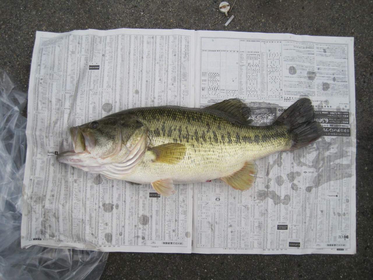 名越がバスを持った写真では遠近感のせいでイマイチ本当の大きさが解り難いので、広げた新聞紙の上に置いて写真を撮ってみました。これで大きさを感覚的に理解できると思います。(ますます現実感が無くなる様な感じもしますが)勿論嬉しいですが、反面寂しい気もします。例えば自分が筑波サーキットで何かの拍子に1周だけ57秒台のタイムを出してしまったようなもので、おそらく生きているうちに2度と更新することは不可能な記録のように思えるからです。明日以降の自分のバス釣りは、もうただのオマケみたいなもののように思えます。