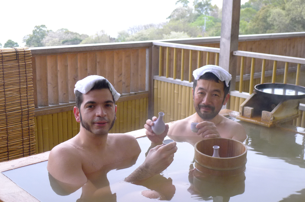 日本のオンセン、タタミルーム、オープンエアバス、サシミ、その他を体験してもらおうと、伊豆の温泉に招待しました。露天風呂ならやっぱりこう来なくちゃ!!!サービス精神旺盛で、頼んだらこんな写真も取らせてくれました。