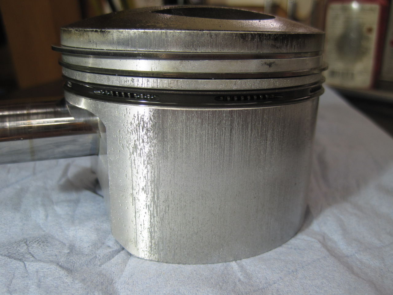 とりあえずエンジンを降ろして分解を始めました。ヘッドナットを外してヘッドとシリンダーを取り外すと、姿を現したのはこんな状態のピストンでした。ぱっと見た瞬間は、焼き付いてる!?と思ったのですが、どうも違うようです。で、判りました。これはサンドブラストの砂で削れたのでしょう。そういえばエンジン全体はウェットブラストのようなもので仕上げられています。その後処理をちゃんとやらなかったので、エンジンの中にサンドブラストの砂が残っていてこんなになってしまったのだと推測しました。