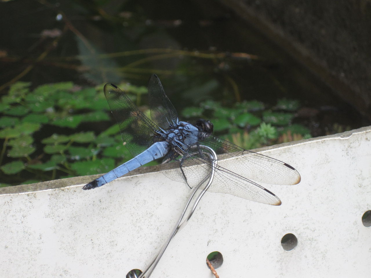 うちの庭には元バスタブだったものを利用した池があって金魚や水草を育てていますが、何時の頃からか毎年この季節になるとトンボがやってきます。シオカラトンボですね。やって来るというよりはおそらく毎年この池に産卵し、育ったヤゴが羽化してまたここに産卵して、というようにこの池を中心に生息して世代交代しているのでしょう。池の周りをテリトリーにしているようで、いつも周辺の何処かに居ます。指を指したりするとかなり反応します。面白いです。