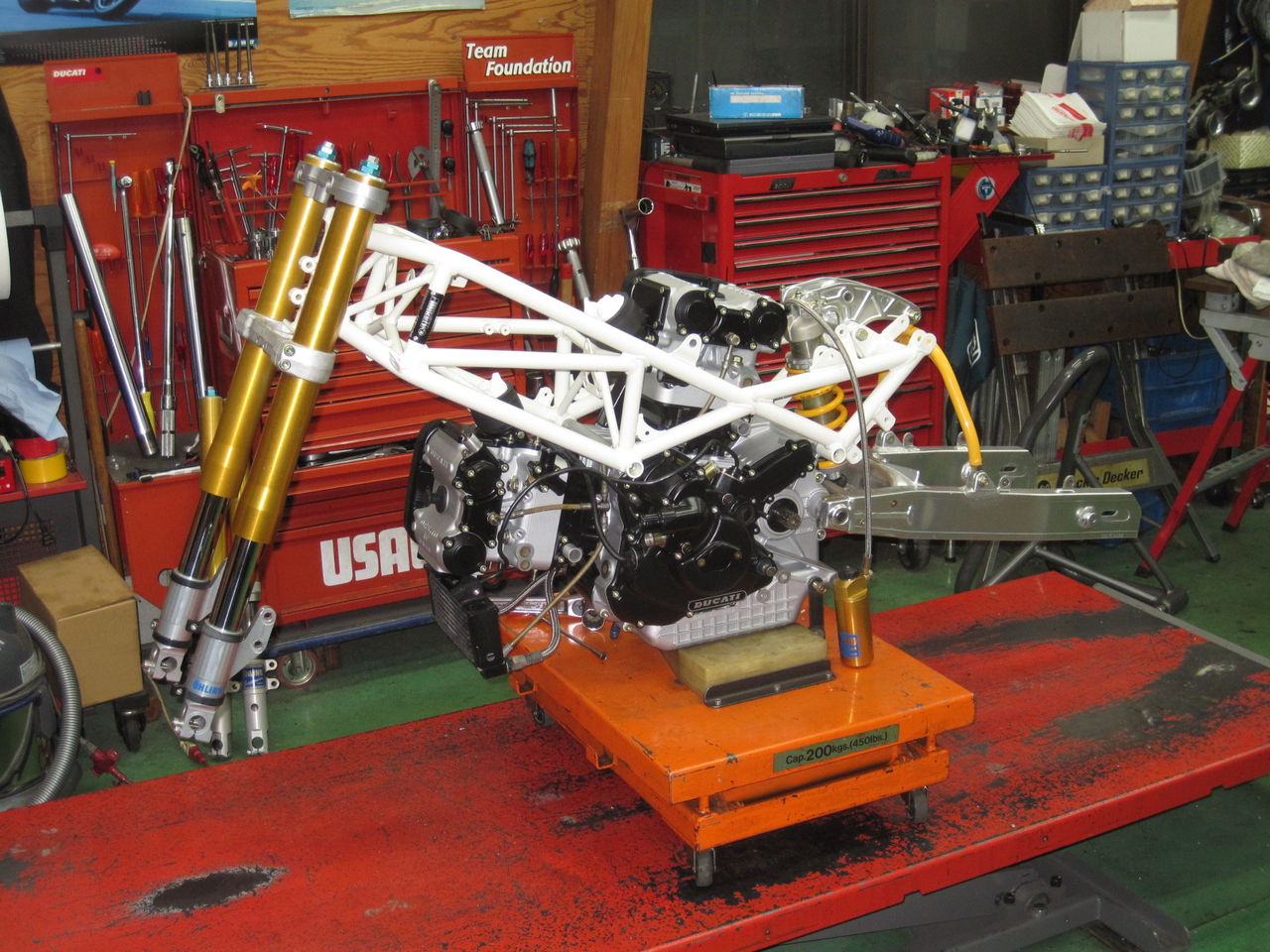 前後の足回りが出来上がったので、早速エンジンをフレームに載せる作業に着手しました。まだ仮組みです。