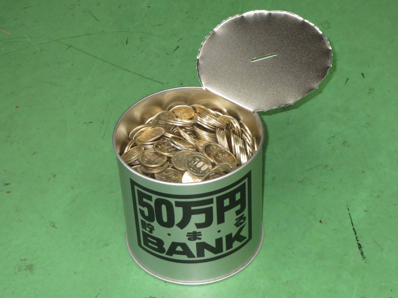 貯金箱がいっぱいになったので開けました。五百円玉だけでいっぱいにすれば五十万円貯まるっていうやつです。数えたら五十万円プラスアルファでした。何年かかったのか確認したかったのですが、貯金開始の日付を書き忘れていたので判りません。10年位かな?