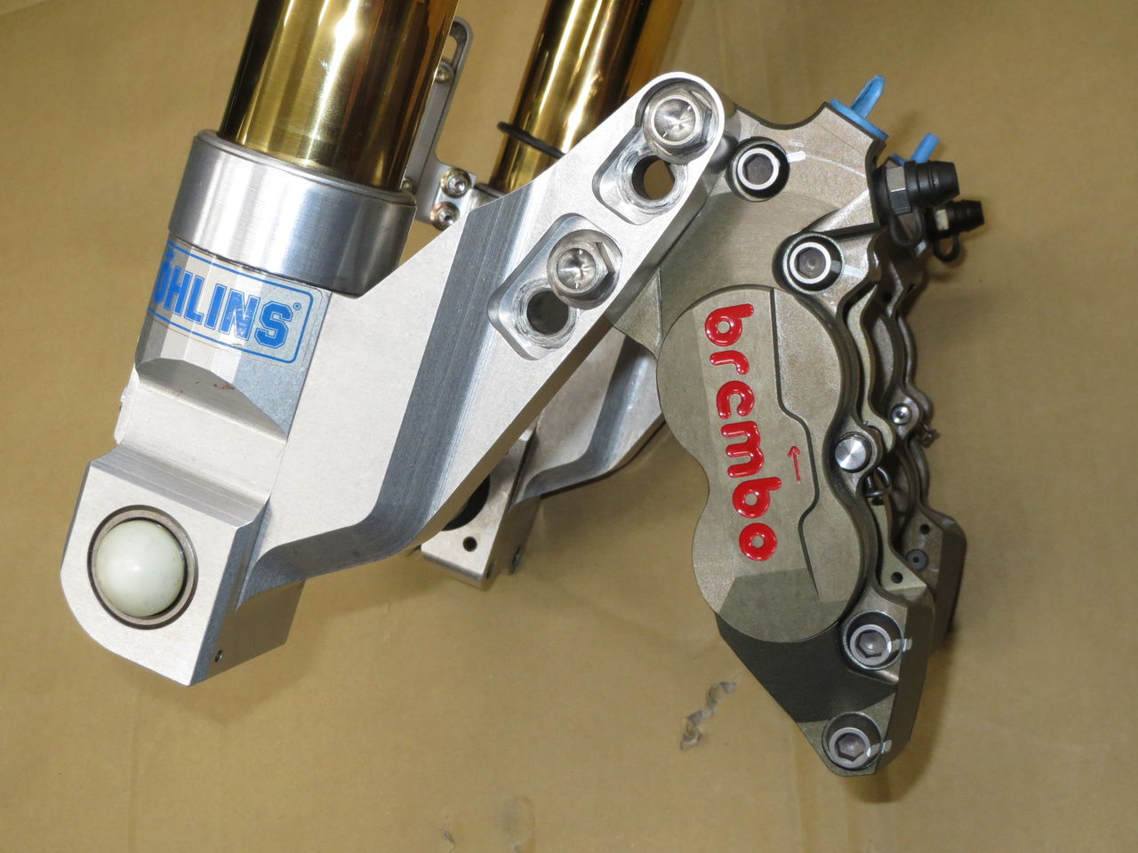 フォークはFG8760というタイプで、916レーシング(コルサ)の1998、1999年型の純正です。ちなみにコルサのGPフォークはドゥカティ専用の設計となっており、オーリンズ汎用GPフォークの流用ではありません。入手するにはドゥカティからコルサの補修部品として購入するしか方法がありませんでした。