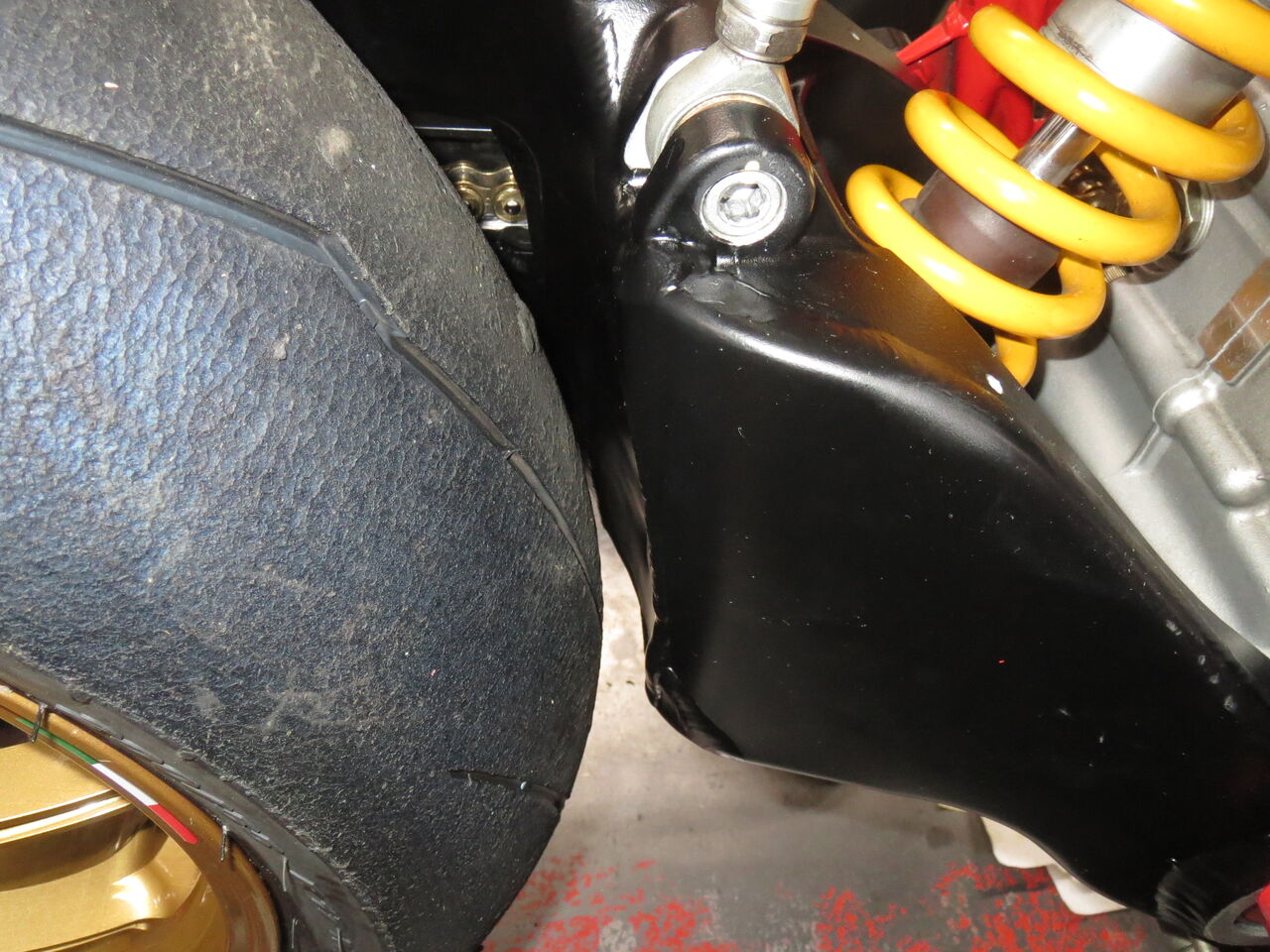 先日紹介した1098系用の改造スイングアーム、早速車両に取り付けてみました。今時の外径が大きなタイヤを履けるようにという改造ですが、実際のところどんな感じなんだろうと興味津々でした。画像は装着状態でのタイヤとスイングアームのクリアランスです。条件としては、ファイナルが15x38(ノーマル状態)、履いているタイヤはスーパーコルサの200/55-17です。クリアランスは実測で約14mmです。このサイズのタイヤなら余裕です。 では200/60タイヤを履くとどうなるのか?そのサイズのタイヤがここには無いので実際にはまだ試していませんが、ピレリのテクニカルデータによると200/55と200/60のタイヤ外径は半径で10mm異なります。要するに画像の状態からタイヤを200/60に変更するとタイヤとスイングアームのクリアランスが10mm少なくなると予想できます。現状で14mmですからそれが4mmになるという事です。ギリギリOKだと思いますが、走行にはおそらく問題無いと思われるもののタイヤウォーマーが入るのか?かなりビミョーです。サーキット走行では問題にならないと思いますが、公道走行では路面から跳ね上げた小石等が挟まりそうです。まあそもそも1098系に200/60タイヤを履くとおそらくバランス的におかしなことになって、メリットがあるのはごく限られた走行条件下で一瞬だけ、という事になりそうと予測しますから、やはりタイヤ的には200/55が賢明な選択であると思います。