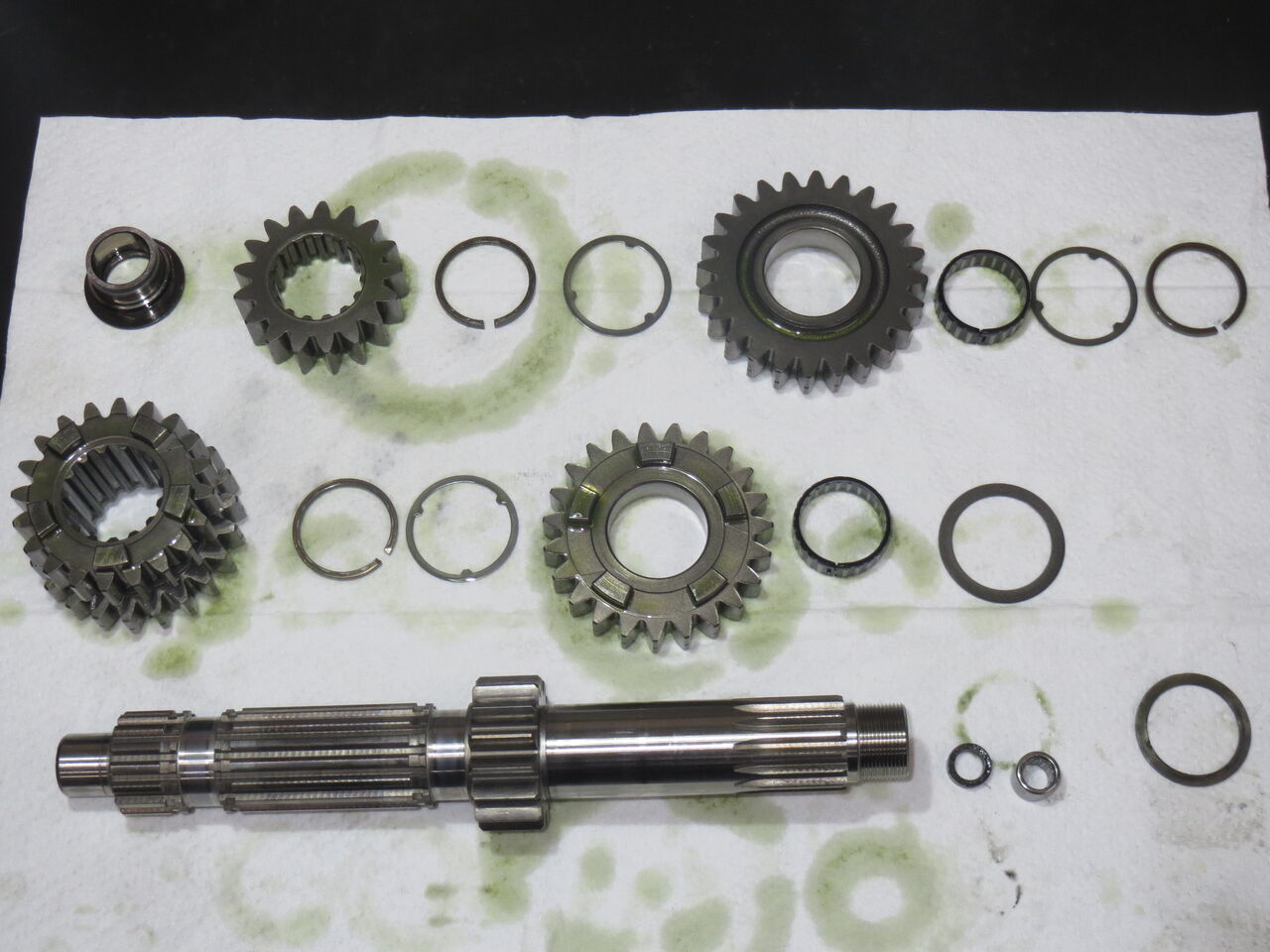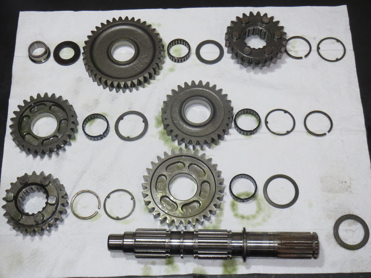 こちらはミッションのメインシャフト(クラッチが付くシャフト)です。こちらも問題ありません。非常に綺麗な状態です。サークリップに加え、クラッチプッシュロッド用のニードルケージとオイルシールは交換します。ここには写っていませんがシフトフォークの状態も同様に良好です。