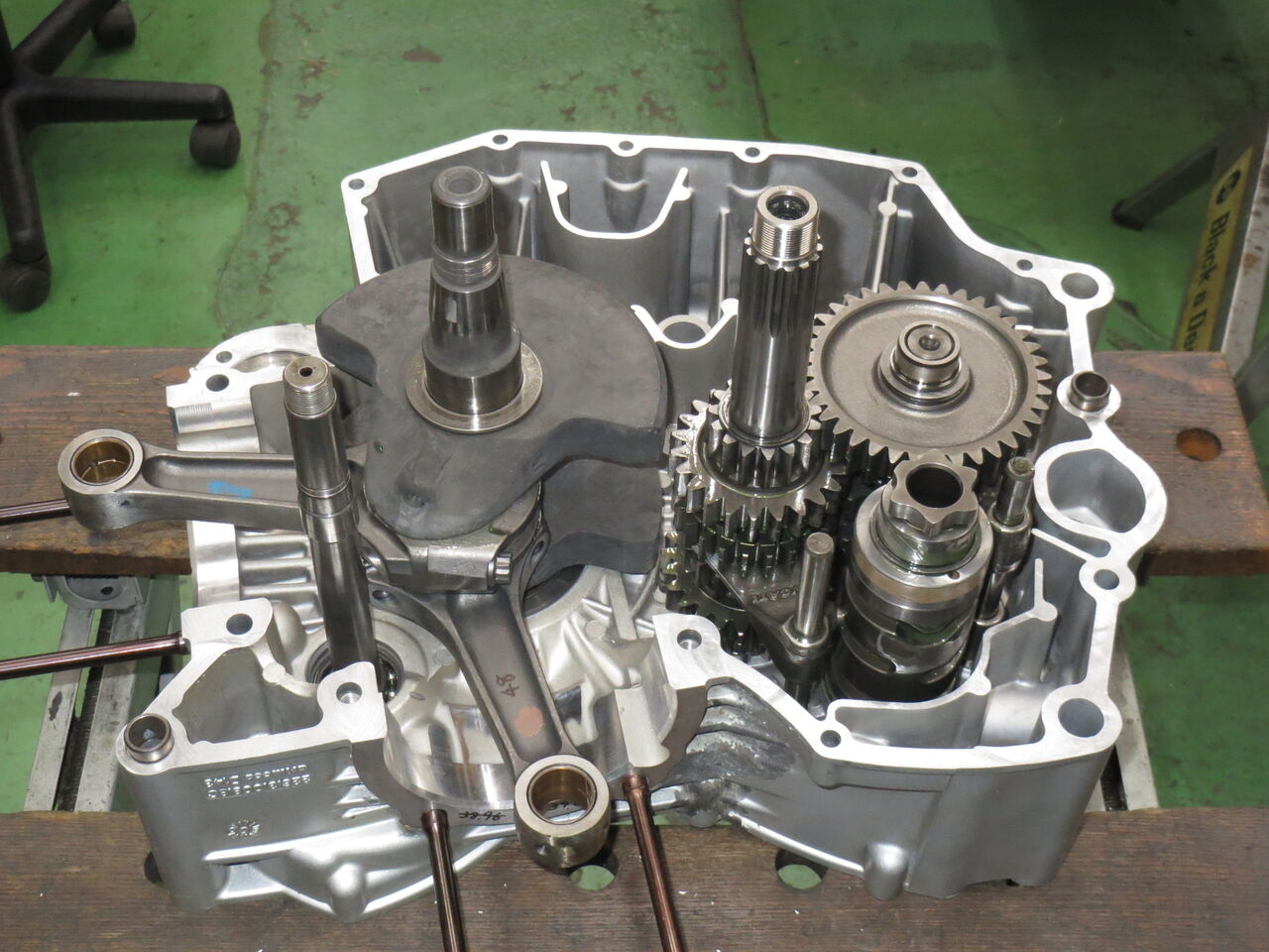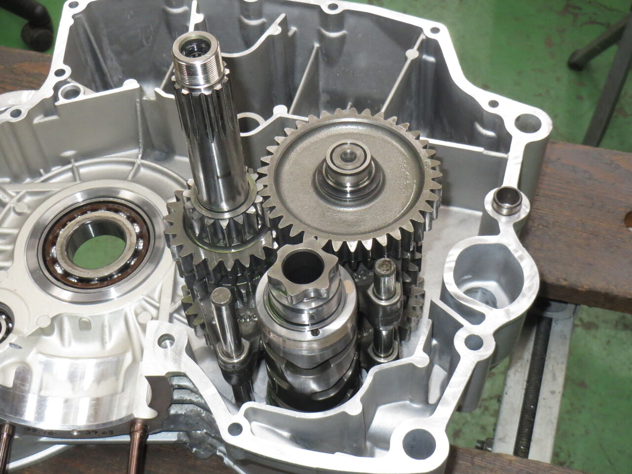 ミッションのシム調整を行っています。ミッションシャフト2本とシフトドラムの左右(この写真では上下になります)にはシムが存在していて、そのシムを変更することによってシャフトとドラムの位置を変更できます。例えばドラムのシム変更は行わずにシフトフォークの可動範囲が一定であるとすると、各ギアのドッグの勘合深さの調整はミッションシャフトの位置に依存します。写真のメインシャフトを例にとると、下側のシムを薄く、その分上側のシムを厚くしたとします。するとシム厚の変更分だけシャフトは下に下がります。その結果シフトフォークで動かされているギアの上側のドッグはその分深く勘合するようになり、逆に下側のドッグの勘合は浅くなります。この方法で全てのギアのドッグの噛み合い具合が良好になる状態を探します。実際には妥協点を探す感じですが。こうして良好な状態に調整したミッションも走行中に無理なシフト等を行った結果シフトフォークを曲げてしまえば一発で台無しになってしまうんですねどね。