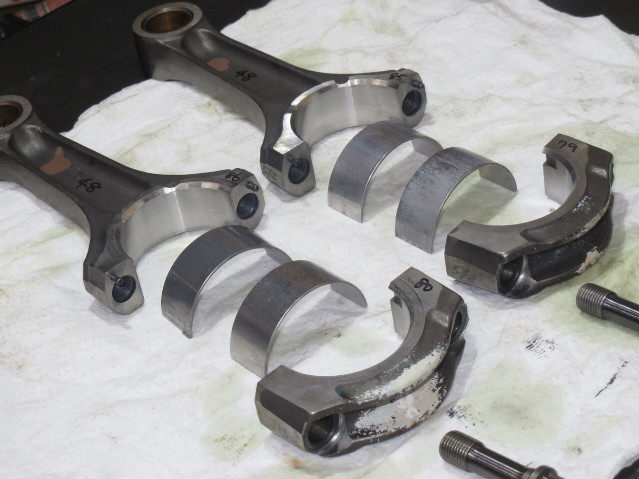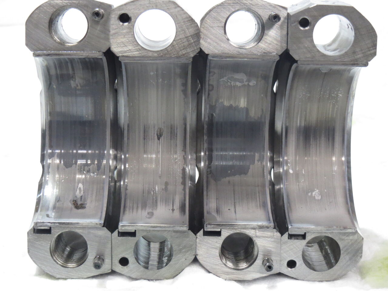 クランクにコンロッドを組み付けました。コンロッドボルトは使い捨て部品なのでメタル合わせを行う時は今迄使用していたボルトを使用します。メタル合わせ終了後にコンロッドをクランクに組む際に新品ボルトを使用します。